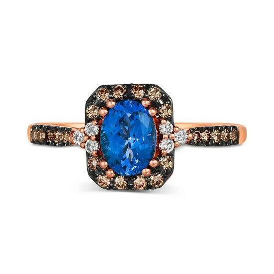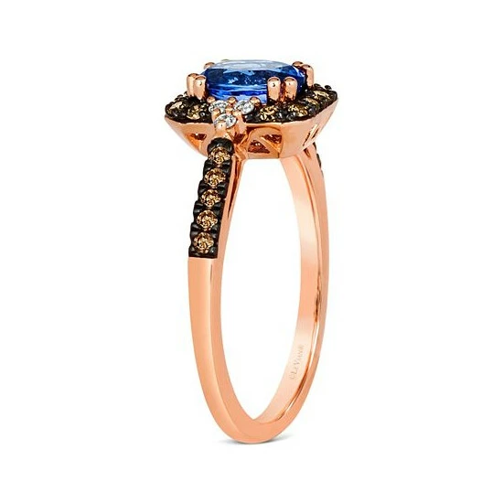 Sweet and sparkly Blueberry Tanzaniteยฎ is enhanced by the elegant glow of Nude Diamondsโข and Chocolate Diamondsยฎ in this stunning halo ring from Le Vian.