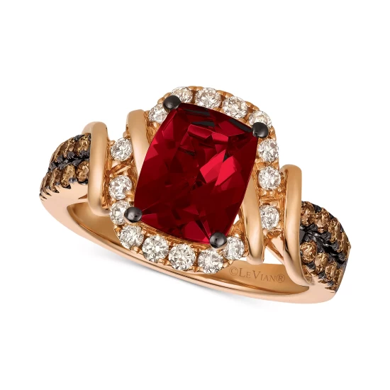 The regal beauty of an elongated cushion-shape Raspberry Rhodolite® is artistically captured in this stunning Le Vian ring designed with elegant round-shape light brown and chocolate diamonds for dramatic effect.