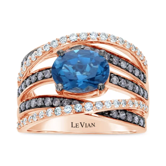 Crisscrossing rows of Chocolate Diamonds® and Vanilla Diamonds® provide a sparkling background to showcase the beauty of a Deep Sea Blue Topaz™ on this fabulous rose gold statement ring from Le Vian.