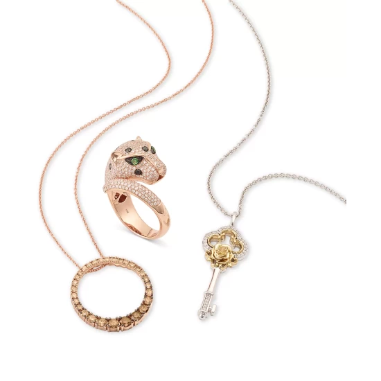 Make a bold and sensational statement in this regal-looking oval-shape rhodium garnet (1 ct. t.w.) ring by Le Vianยฎ featuring an ornate design created of round-shape white and chocolate diamonds (5/8 ct. t.w.). Set in 14k rose gold with black rhodium-plated detail.