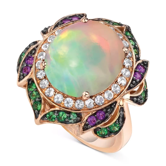 Draw yourself into the beauty and power of this stunning Le Vian ring featuring an enigmatic oval-shape Neopolitan Opal™ set amidst colorful petals of round-shape Forest Green Tsavorite™, Grape Amethyst™ and Vanilla Topaz™.