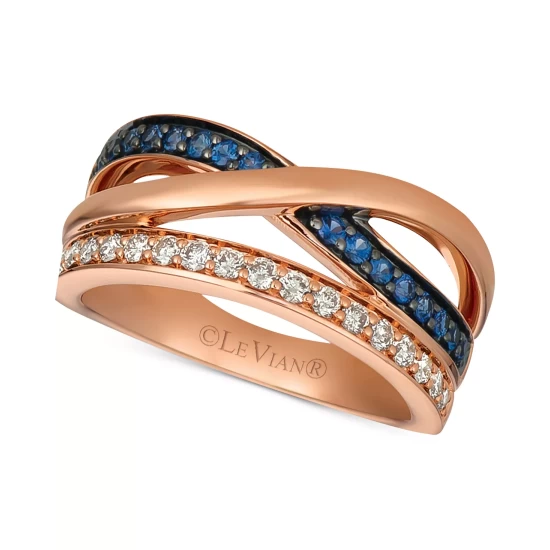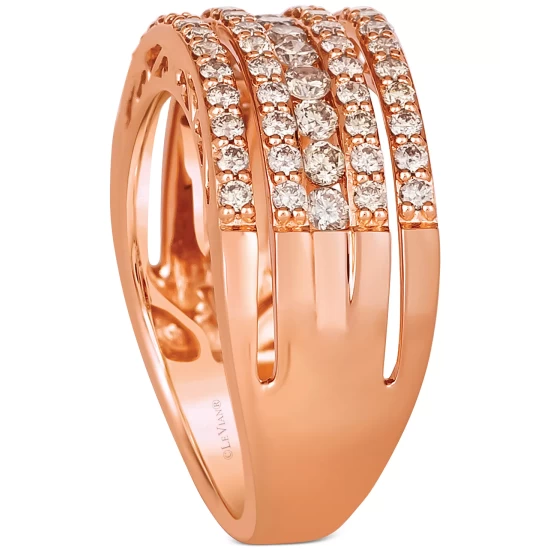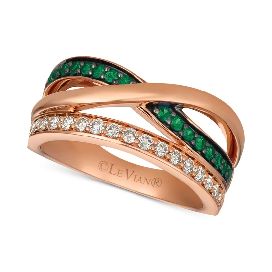 A crosscrossing band of fabulous round-shape emeralds is lit up with the unique sparkle of round-shape light brown diamonds in this ultra-chic ring by Le Vian.
