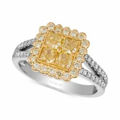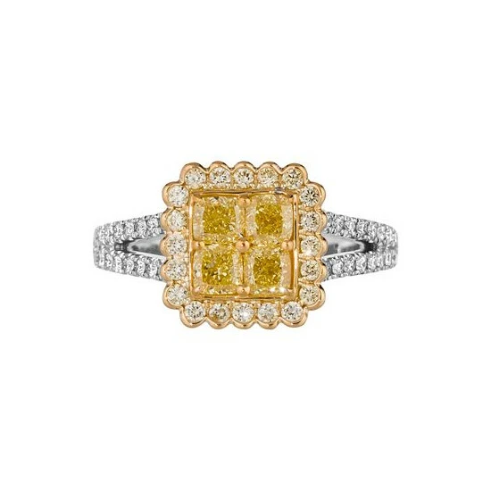 Four striking Sunny Yellow Diamondsยฎ are set within a scalloped halo of Vanilla Diamondsยฎ on this gorgeous ring set in platinum and 18k yellow gold.